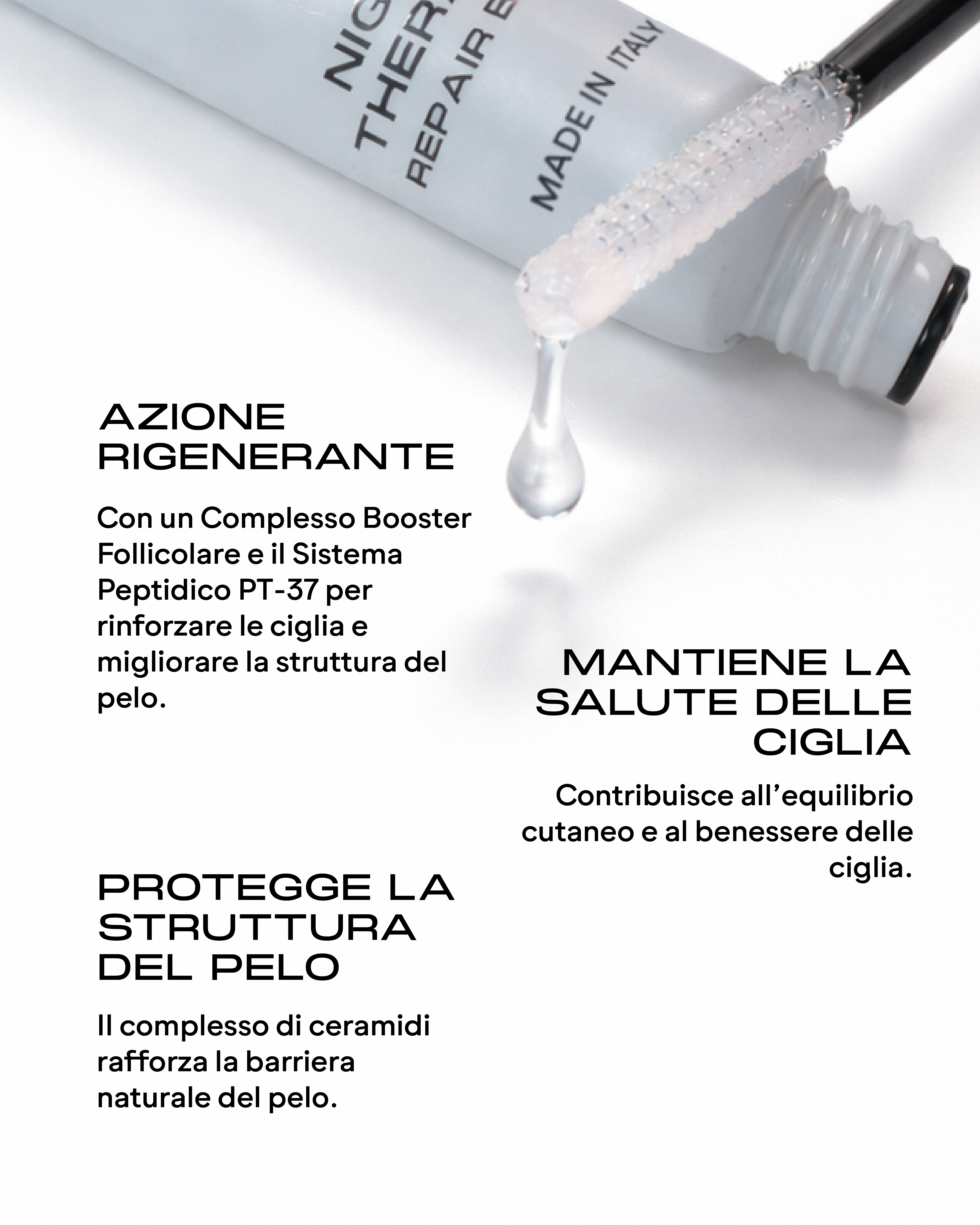 Night Therapy Repair Balm è un trattamento intensivo studiato per rigenerare e sostenere ciglia e sopracciglia durante la fase di riposo. La sua formula esclusiva combina attivi botanici con complessi rinforzanti avanzati.